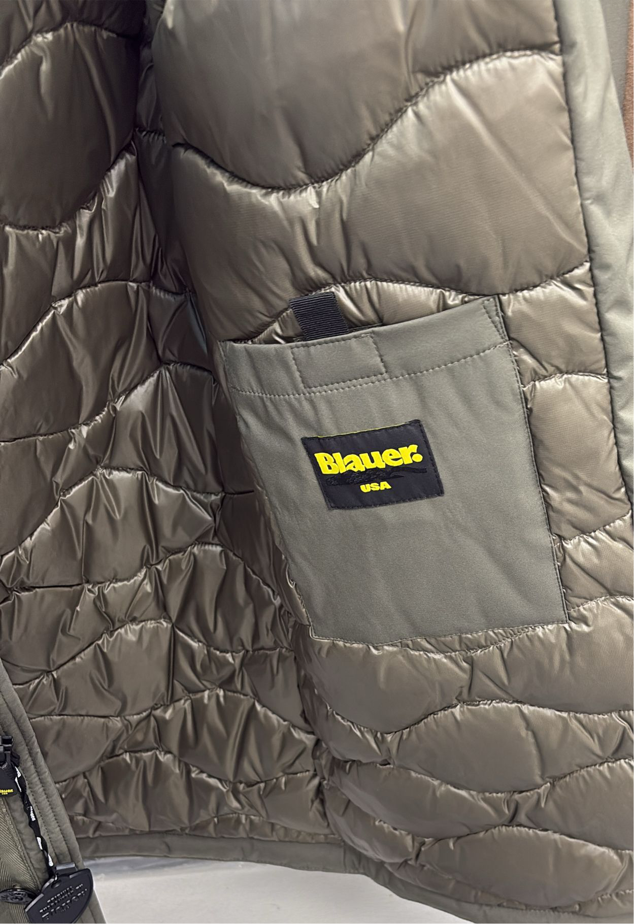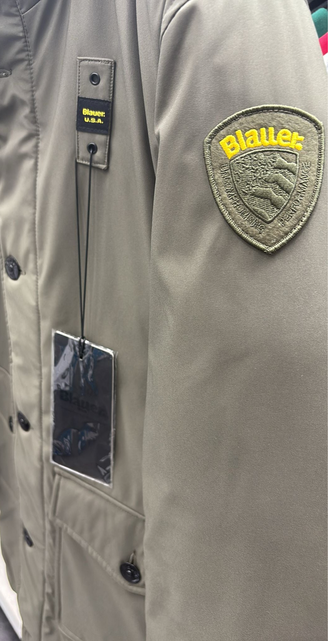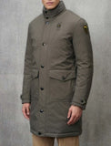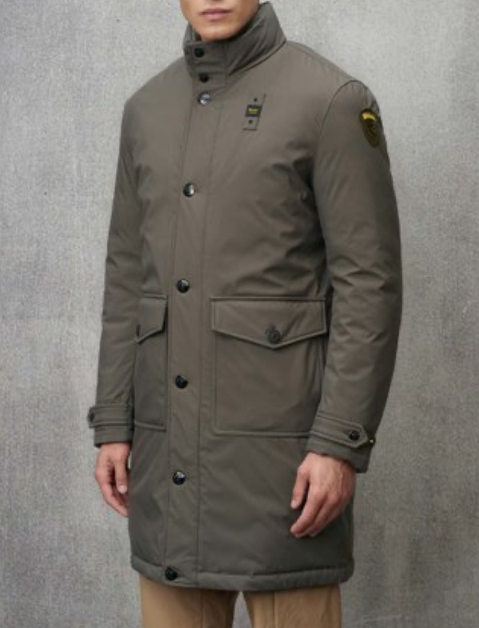 GIUBBINO BLAUER UOMO LUNGO CON CERNIERA E BOTTONI , GIROCOLLO , E LOGO BRACCIO SCRITTA GIALLA